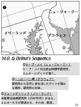 エムオーとデイナのシークエンスですが、彼らはカイロ行きインディアナ航空370便でハイジャックを決行するが失敗し収監。エムオーが発病すると、メリ−ランド州アメリカ陸軍フォート・デトリック基地内にある米陸軍伝染病医学研究所に収容されます。ここを脱走しニュージャージー州のケープ・メイ州立総合物理学研究所に逃げ込み、フロイド博士の装置によって、デイナは研究所の側のケープ・ヘンローペンに転送され、エムオーは行方不明となります。 | |