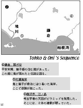 | 平安末期に鎌倉に住んでいた武将の娘。好奇心の強い少女だが、不治の病に犯されている。庭に現れた「鬼」を匿っており、徐々に鬼との間に情が芽生える。「鬼」が出ていこうとした時、自分も連れていって欲しいと嘆願する。籐子は「鬼」と逃げるがすぐに追っ手がかかる。結局片瀬海岸まで辿り着き、目の前に現れた三角山(ピラミッド)に足を進める。 | |