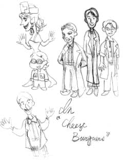 今回のテーマは「食」ということで、ガストロノミー?それともグルメ物?といろいろ考えました。しばらく演出と話しあいを重ね、視点を一度「医療」に移す事を思い付き、医者モノになりました。そもそも中国では「医食同源」と言いますし、薬と食べ物、どちらが口に入れる時、その正体が気になるかと考えた時、これは医療で行こうと思いました。そもそも、「どうしてみんな、自分が口に入れるモノに、そんなに無頓着でいられるのだろうか?」という所から、創意が始まっているのです。物語の背景は、病院での人肉食というグロテスクな物です。病院のイメージはあくまでも、狂気の秘密に満ちた閉鎖的な空間です。要するに「迷宮」なのです。ちょうど『キングダム』のような感じかもしれません。そして、これだけダークな背景の上でショーアップ・コメディが繰り広げられてしまう所が、やはりキッチュで、キャンプな感じです。そして、「チーズバーガーズは、近代理性主義批判の寓話です。科学と教育の世紀に対して投げかけられたスプーン一杯のメラトニンのようなものです。」との言葉が語るように、理性や科学至上主義、西洋的価値観にちょっと眠ってもらおう(メラトニンは睡眠ホルモン)と言う趣向でもあります。食という行為を生肉に対する、味や香りでの隠蔽ととらえ、医療にはびこる隠蔽とつきあわせたこの作品は「お笑い」でありながら、一つの文化論を提示していて、しかも病院での人肉食というショッキングな題材で私の脚本の中でも相当の異色作のような気がします。 さて、今回登場するのは、4人の医者と1人の患者です。主役はこの患者ではなく、1人の医者です。彼はソルボンヌで天才的な手術能力を身に付け、アメリカのスローン・ケタリング記念病院の誘いを蹴って、横浜にある甚大総合病院にやってきます。この病院の「迷宮」に翻弄されていきます。彼の名は、井村義彦です。この人の名前には、特に出典がありませんが、残りの医者たち、甚大院長、外科部長の澤田、医者でドラッグクィーン(薬理学者かも)のルナルナの名前は、医者モノのバイブル『ブラックジャック』から取りました。作品中にも何ケ所か『ブラックジャック』からの引用シーンがあります。また、参考文献として、R.ヤングソン『危ない医者たち』青土社、トム・ダマー『チベット医学入門』春秋社、中野美代子『カニバリズム(人肉嗜食)論』潮出版社などを参照しました。 また、 この作品では、ドラッグ・クィーンのLuna☆Runaが歌い踊るのですが、その選曲については、作者の方でわりと決定していたので併せて紹介します。ルナルナは、ミュージカル・ナンバーの他にシャンソンを歌う(口パクということです)設定になっています。 ジュリー・アンドリュースの声で 『サウンド・オブ・ミュージック』から「ひとりぼっちの山羊飼い」 「自信をもって」、 アン・ミラーの声で 『キス・ミー・ケイト』から「トゥー・ダーン・ホット」などが歌われました。 *上のスケッチは、院長先生を演じた木村修による |