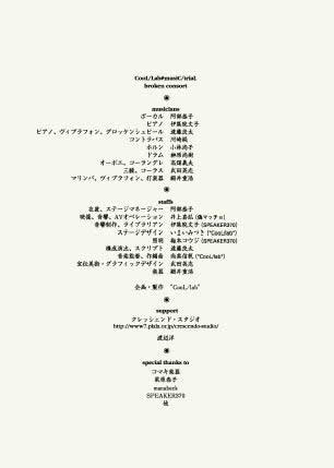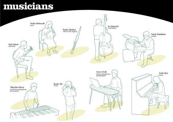 ●Eishi Takeda san-xian●Naoko Kobayashi horn●Yoshio Takahata oboe,corno inglese●Jun Kawasaki contrabass●Naoki Sakakibara drums●Shigehiro Hosoi marimba,vibraphone,percussions●Kyoko Abe vocal●Lyouta Endo piano,vibraphone,glockenspiel●Ayako Ijuin piano